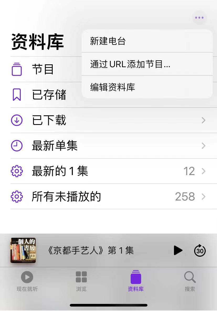iOS 用户也可以使用 Apple 内置的紫色图标的播客 Podcasts 订阅“一个人的书房”,方法如下: